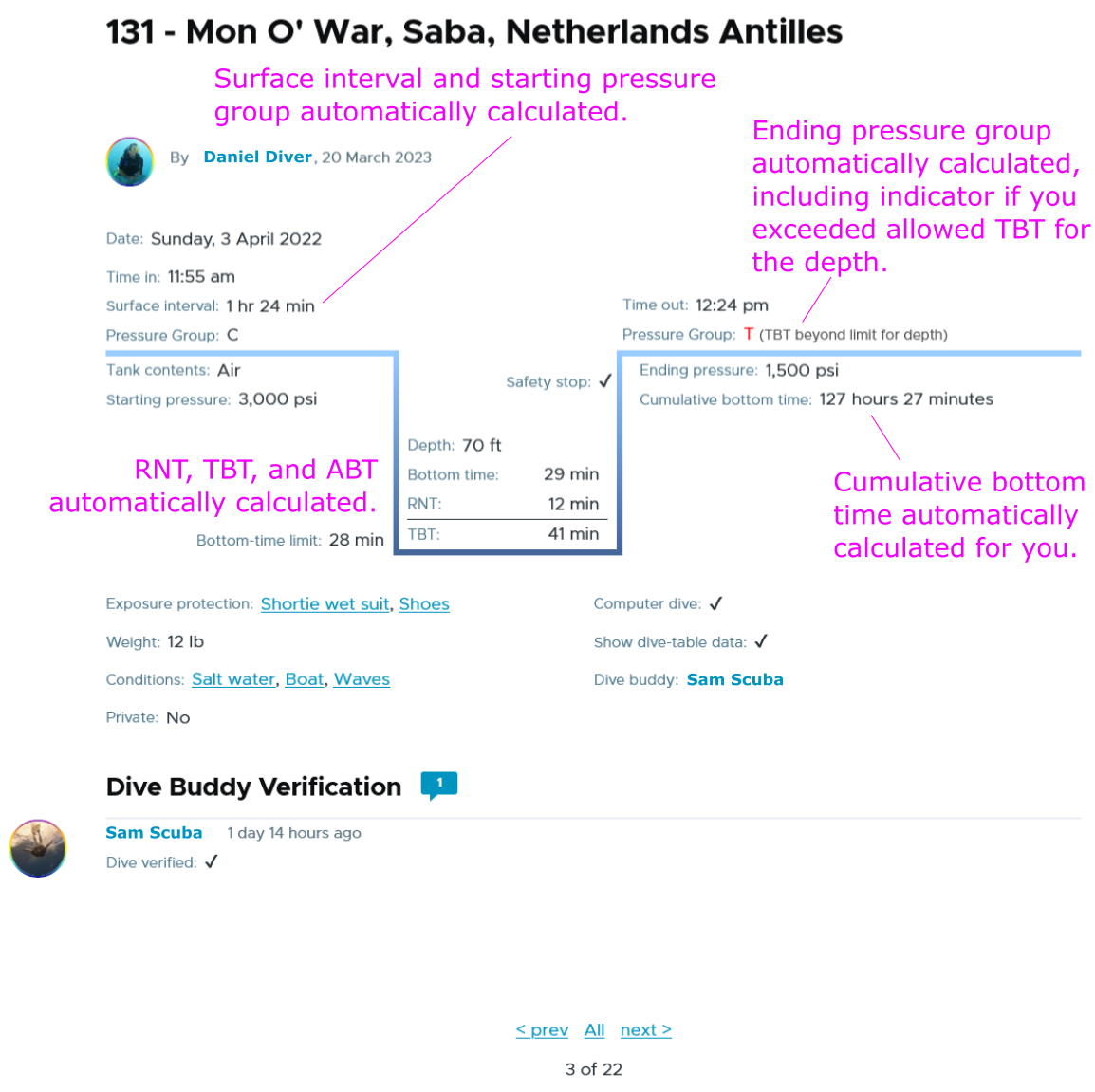 Your dives are listed for you in a summary form with date, dive number, location, depth, bottom time, and any notes. Just click on the dive title to see all the details of that dive. Page through your dives easily to see all your dives. If your dive buddies also have accounts, you can see their dive logs too if they've picked you as a buddy and have given you permissions to see their dives.